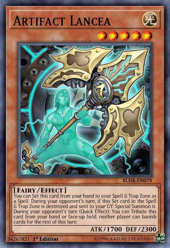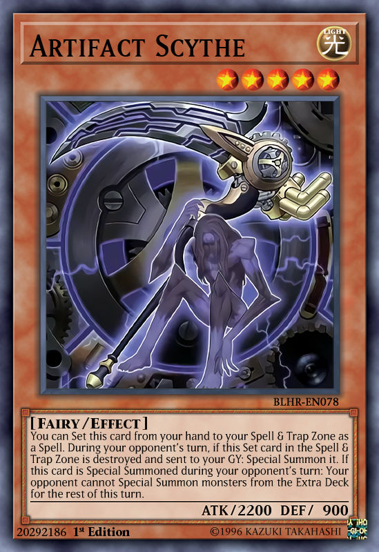 Cùng với Lancea, một Artifact khác cũng được xuất hiện trở lại là Scythe (và Sanctum) nhằm tối ưu hiệu quả của engine này. Khi resolve thành công, khả năng của Scythe cấm đối thủ động vào Extra Deck thậm chí còn mạnh hơn Lancea và shutdown hầu hết các deck trong metagame hiện tại. Điểm trừ duy nhất là việc lỡ rút phải Scythe thì khá khó giải quyết, tuy nhiên vô tình Ryzeal lại có thể xử lý tình huống này với Tornado Dragon biết tự bắn S/T bản thân. Cùng với Sanctum biết gọi thẳng cả Lancea và Scythe, engine Artifact hiện đang được rất nhiều bài thủ tin dùng bởi hiệu quả cao của nó.