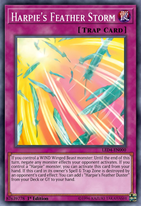 Harpie's Feather Storm được biết đến như một lá Trap cực mạnh, có khả năng “vô hiệu hoá" đối thủ cả turn nhưng chỉ dùng được trong một số deck đặc thù như Floowandereeze. Tuy nhiên mới đây, Top 8 Team YCS Santiago Rafael Reich cùng các đồng đội đã tìm ra cách tận dụng hiệu quả lá bài này trong deck Snake-Eye, đó là combo cùng với Swamp Mirrorer được set bởi Silhouette Rabbit.