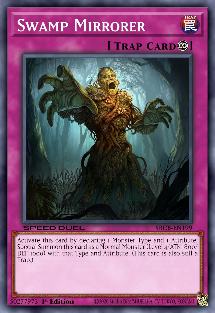 Khả năng của Swamp Mirrorer cho phép triệu hồi bản thân dưới dạng một Type/Attribute bất kỳ, trường hợp này sẽ chọn Winged Beast/Wind cho phù hợp với Harpie's Feather Storm. Chỉ cần hard draw Harpie's Feather Storm (hoặc set bởi Triple Tactics Thrust sau khi ăn handtrap), chúng ta có thể tính ngay đến bài gọi Silhouette Rabbit set Swamp Mirrorer từ Deck và “skip” turn sau của đối thủ.