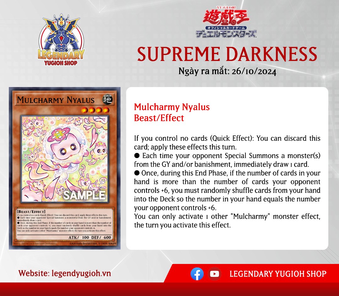 Tiếp bước Purulia và Fuwalos, Nyalus là Mulcharmy thứ 3 liên tiếp ra mắt trong Main Set. Không ngoài dự đoán, Mulcharmy lần này sẽ giúp người chơi rút bài khi đối thủ triệu hồi từ GY và Banish. Liệu Nyalus có trở thành hiện tượng giống như hai đàn anh không?