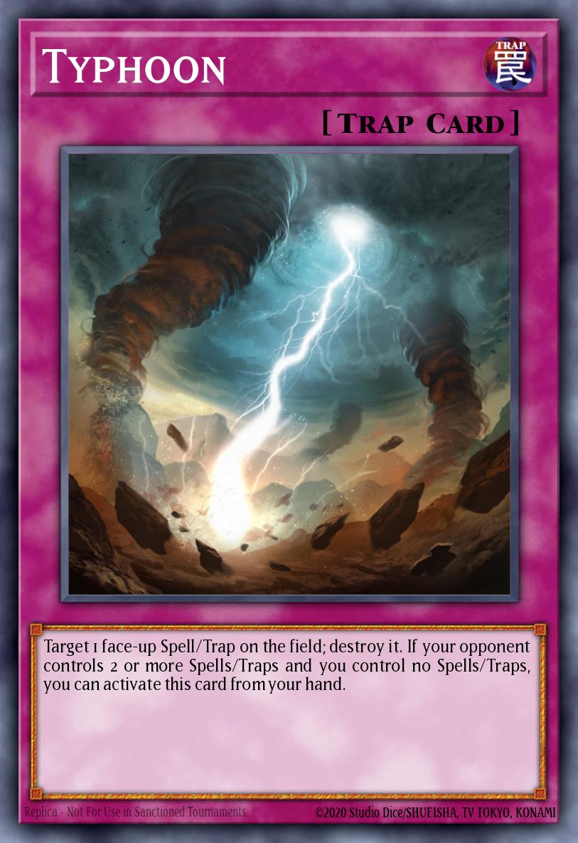 Typhoon có thể coi là “Hand Trap" theo nghĩa đen đời đầu với khả năng khá thú vị, tuy nhiên lại bị ghẻ lạnh vì chỉ hoạt động tốt trong rất ít format. Nhưng đến hiện tại, Typhoon nổi lên như một tech card có thể đối đầu với khá nhiều meta.