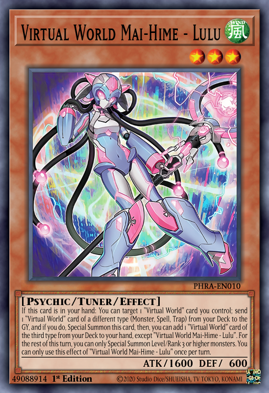 Virtual World thường triển khai combo từ Virtual World Mai–Hime - Lulu vì đây là lá bài cộng tài nguyên nhất của deck , Trong trường hợp không bốc được, Lulu vẫn có thể được lấy lên tay nhờ effect của Virual World Gate-Qinglong. Với các mảnh ghép level 3 và 6, Virtual World sẽ triệu hồi ra boss phù hợp với tình huống từ extra deck.