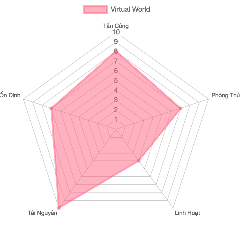 Tấn Công 8 điểm: Với dàn boss đa dạng và mạnh mẽ từ extra, Virtual World sở hữu khả năng gây sát thương khá đang nể, tuy nhiên vẫn chưa có boss nào sở hữu sức tấn công thực sự cao.