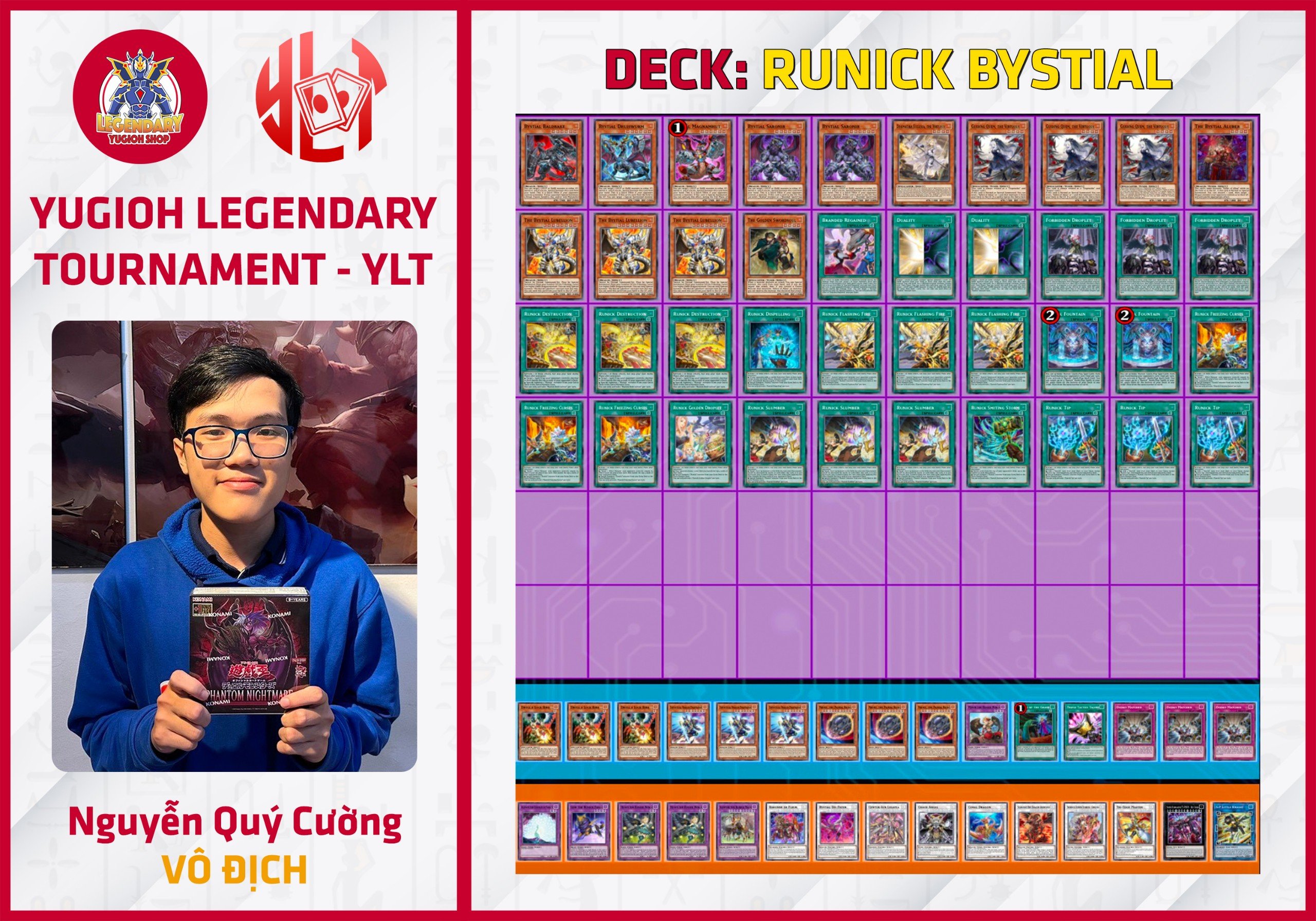 Cuối cùng, sau vòng bán kết và tứ kết, 2 cái tên góp mặt vào chung kết chỉ còn Therion Horus và Runick Bystial với sự lên ngôi vô địch đầu tiên của mùa giải thuộc về Runick Bystial của bài thủ Nguyễn Quý Cường. Độ ổn định áp đảo của Runick sau nhiều turn, cùng với những Bystial biết nhảy sân liên tục, cộng với mini engine tuner Ecclesia (Incredible Ecclesia, Guiding Quem, The Golden Swordsoul,...) đã cộng hưởng nên chức vô địch này. Điều thú vị hơn, deck list này được truyền cảm hứng rất nhiều từ Joshua Schmidt - 1 bài thủ hàng đầu của thế giới Yugioh. Raidraptor cán đích top 4 tiếp tục chứng minh bản thân là 1 thế lực thực sự sau khi có support khiến tất cả phải dè chừng. Chiếm vị trí top 4 còn lại, Plunder Patroll thực sự là 1 thành công vang dội dành cho fan của bộ bài hải tặc này.