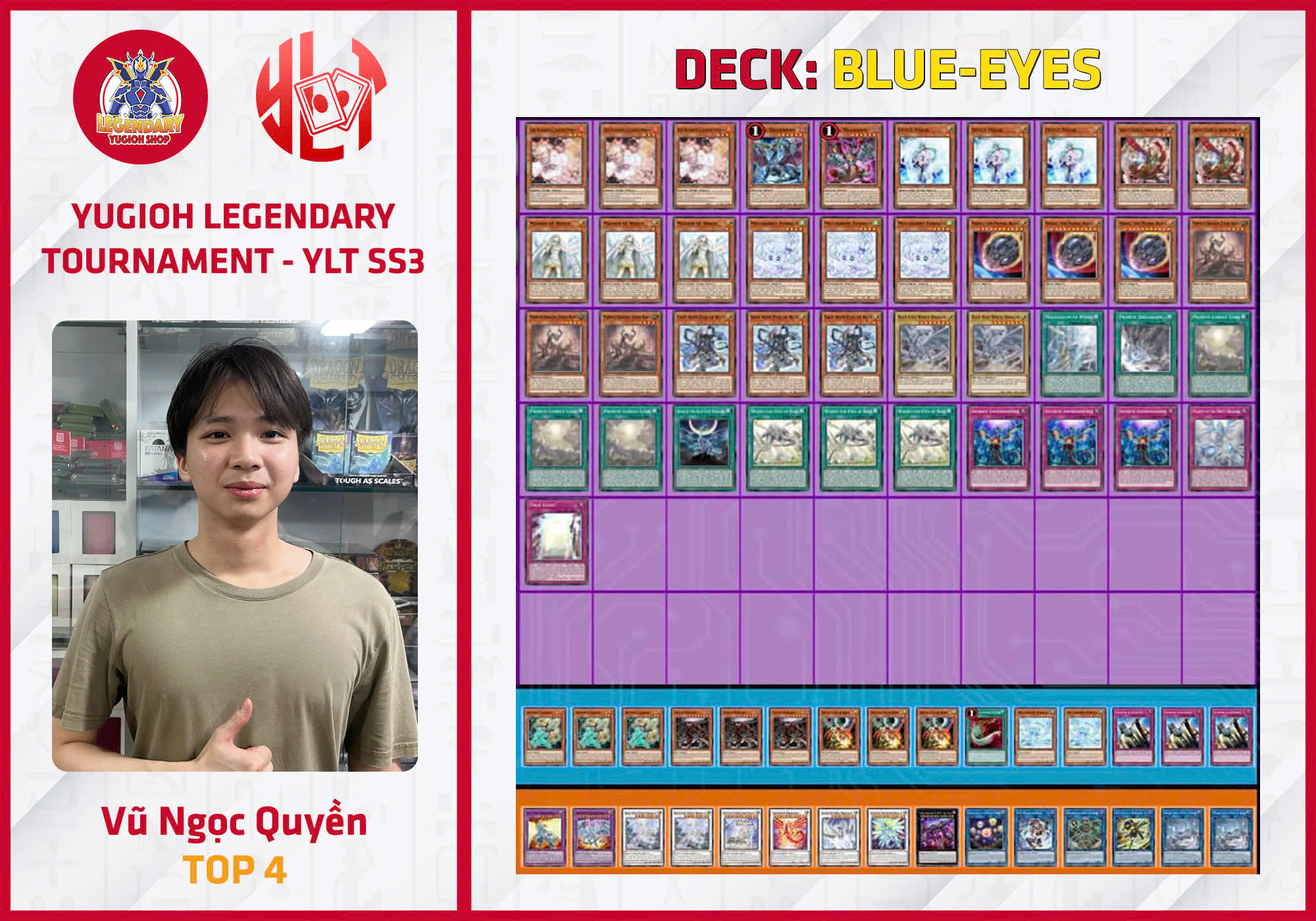 Sau thế trận giằng co, Fiendsmith vẫn cho thấy sự ưu việt và linh hoạt trong cách vận hành hơn, cùng với những Magibu và Unchained rất cơ động và hợp lối chơi đã góp phần làm nên chiến thắng cho bài thủ Nguyễn Quý Dương trong giải đấu lần thứ 3 này. Bộ bài Tachyon hay và độc lạ, nhưng như vậy là chưa đủ để làm nên kỳ tích cho Phùng Đức Duy tại giải đấu. Chức vô địch này đẩy Nguyễn Quý Dương lên thẳng top 3 giải đấu, dù vẫn kém top 1 Nguyễn Đắc Duy tới...14 điểm. Nhưng cơ hội là vẫn còn cho toàn bộ các bài thủ bởi giải đấu cuối cùng sẽ là bước chạy đà của chức vô địch mùa 3. Hãy cùng theo dõi tiếp giải đấu của chúng tôi!!