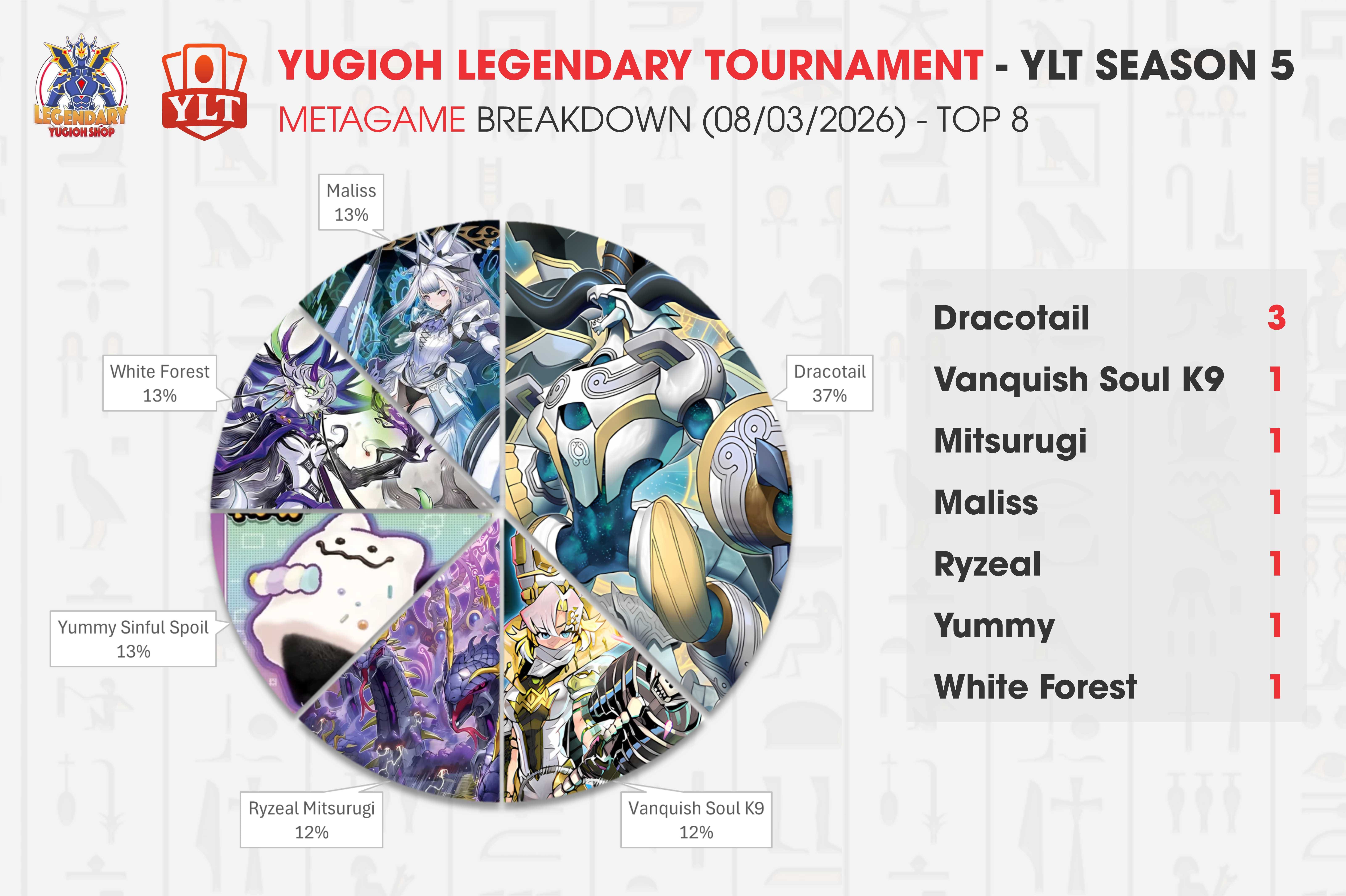 Sau 5 round đấu căng thẳng, 8 bài thủ xuất sắc đã được chọn ra để đi tiếp vào vòng loại trực tiếp gồm: Cao Hoàng Dương (White Forest), Chu Hải Long (Dracotail), Nguyễn Lê Cường (Ryzeal Mitsurugi), Dương Khắc Tuấn Sang (Dracotail), Hoàng Minh Hiếu (Maliss), Vũ Ngọc Quyền (Dracotail), Nghiêm Thanh Bình (Vanquish Soul K9), Lê Hoàng Việt (Yummy Sinful Spoil). Meta giải đấy lần này không ngoài nhiều dự đoán khi Dracotail vẫn là chiến thuật phổ biến nhất chiếm đa số bánh meta nhờ khả năng đi sau mạnh mẽ và kiểm soát tài nguyên vô cùng tốt. Đồng thời nhiều bài thủ cũng đa cập nhật nhanh chóng những chiến thuật mới như Yummy Sinful Spoil của Lê Hoàng Việt đã lách qua khe cửa hẹp với hiệu số 3-2 để vô được top 8. Đồng thời nhưng cái tên kì cựu vô top nhiều giải đấu trước đó như Nguyễn Lê Cường, Hoàng Minh Hiếu cũng góp mặt, dự đoán sẽ là những trận thi đấu hấp dẫn và mãn nhãn !