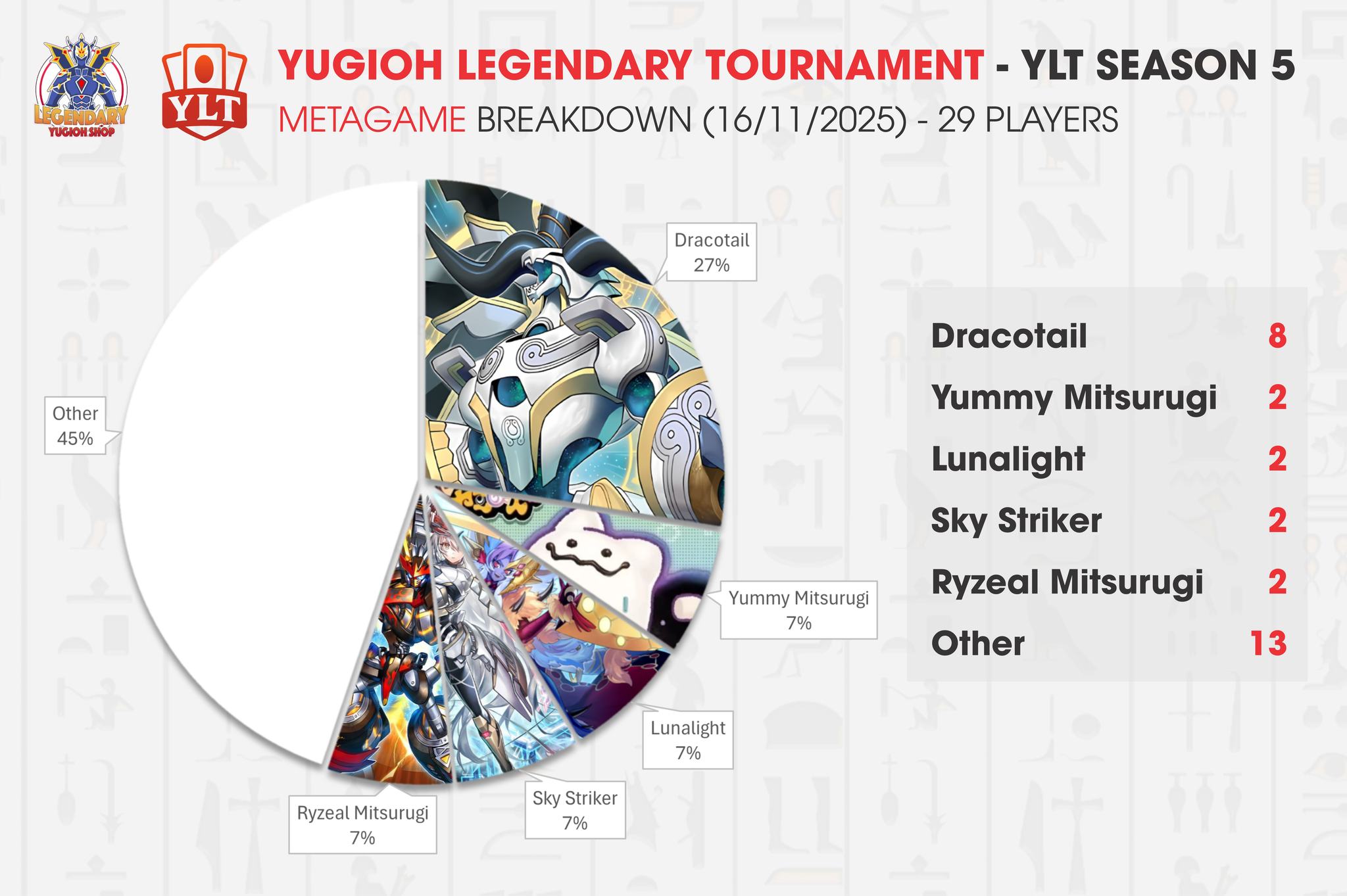Không ngoài dự đoán khi Dracotail - archertype được hưởng lợi nhiều nhất đến từ sản phẩm mới của Konami cũng như "Emergency Banlist" vừa rồi, đã có màn thể hiện áp đảo khi chiếm tới 27%, hơn 1/4 giải đấu. Không sai khi nói chiến thuật này hiện đang là tier 1 meta TCG tại Hà Nội, áp đảo hoàn toàn phần còn lại. Engine Mitsurugi đang dần được ưa chuộng sử dụng cho bộ bài khác nhau, điển hình là Yummy và Ryzeal. Đặc biệt là Yummy Mitsurugi với khả năng combo ổn định, sử dụng Herald of the Arc Light để search Ame no Habakiri no Mitsurugi, sau đó Shamisen Samsara Sorrowcat có thể tự nhảy lên bằng cách đá Herald về lại Extra Deck để tiếp tục lên lại, khiến end board của bộ bài giờ đây đã cực kì vững với nhiều lớp disrupt mạnh mẽ cũng như lượng follow-up khổng lồ. Bên cạnh đó còn có những cái tên có thể tạo nên bất ngờ như Lunalight, Sky Striker, D/D/D, Branded... Khiến cho giải đấu đang nóng hơn bao giờ hết.