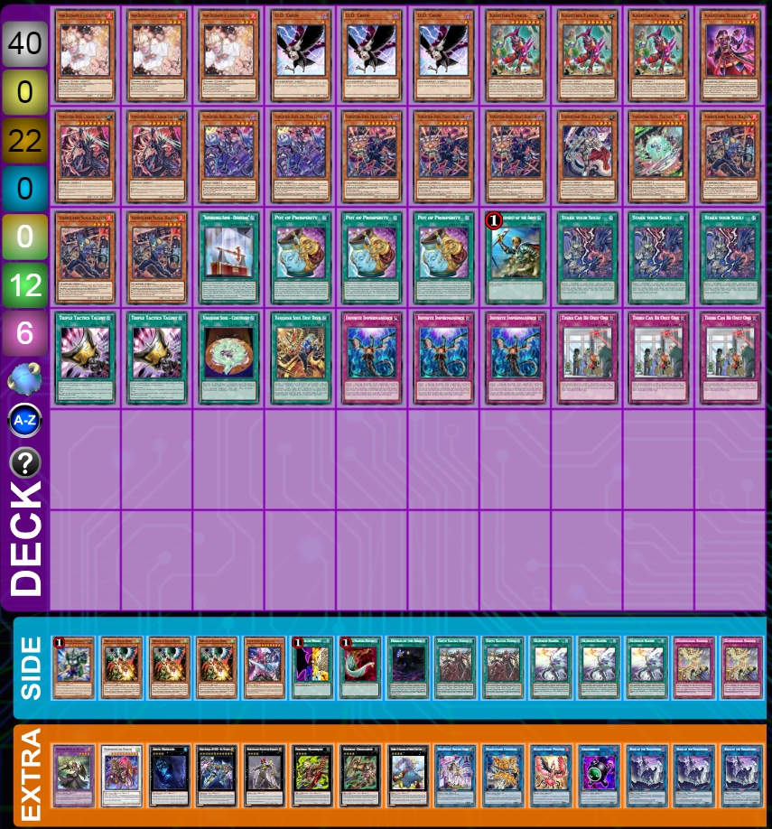 Có ít nhất hai quái vật Vanquish Soul thuộc mỗi thuộc tính, vì vậy hiếm khi nào bạn không thể triệu hồi đặc biệt một quái vật bằng Stake Your Soul! Điều này cũng cho phép bạn phát huy lợi thế của mình vào cuối trận, khi có thể sử dụng Extra deck một cách tối ưu để kết thúc trận đấu.