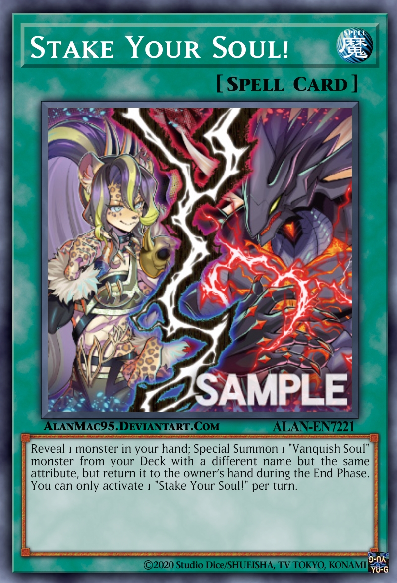Stake your Soul! là cách chính để dễ dàng triệu hồi đặc biệt một quái vật Vanquish Soul từ bộ bài. Quái vật mà nó triệu hồi phải có cùng thuộc tính nhưng có tên khác với quái vật được tiết lộ (Lưu ý: Quái vật được triệu hồi đặc biệt thông qua lá bài này sẽ quay trở lại bàn tay ở giai đoạn cuối, điều này thường là một nhược điểm nhưng lại là điểm tích cực cho Vanquish Soul vì họ muốn có quái vật trên tay).
