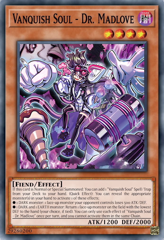 Vanquish Soul Dr. Mad Love là quân bài chủ chốt trong việc gây gián đoạn cho đối thủ của Vanquish Soul. Đồng thời, Mad Love sẽ giúp tìm kiếm một phép/bẫy Vanquish Soul khi được triệu hồi nhưng rất tiếc là không thể lấy được Stake Your Soul!. Việc đẩy một lá bài lên tay rất mạnh, đặc biệt là đối với quái vật được triệu hồi từ Extra Deck, vì nó sẽ quay trở vệ extra thay vì quay lại tay để tiếp tục triệu hồi. Hiệu ứng của Dr. Mad Love không target hay destroy, đây là một điểm cộng vì sẽ giúp người chơi vượt qua hầu hết mọi hình thức bảo vệ của đối thủ và đặc biệt né các hiệu ứng quái thú kích hoạt khi bị tiêu diệt và gửi xuống Mộ.