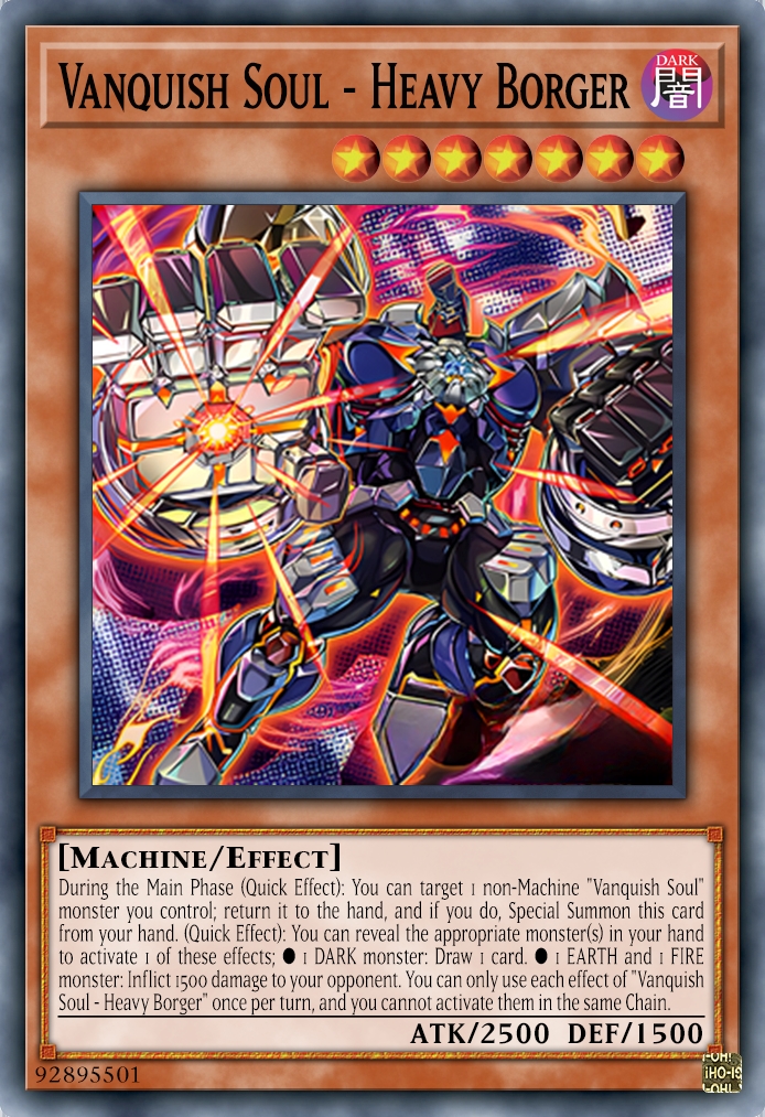 Vanquish Soul Heavy Borger với khả năng tự triệu hồi bản thân tương tự như Caesar Valius nên cũng sẽ giúp các quái thú Vanquish Soul né được các lá bài vô hiệu hóa hay tiêu diệt bằng cách target. Decode Talker Heatsoul một quái thú link 3 được sử dụng hầu hết trong các chiến thuật cyberse khi cho phép bốc 1 lá bài khi trả 1000 máu, Borger có thể làm tương tự nhưng chỉ yêu cầu tiết lộ một quái thú bóng tối trên tay. Hiệu ứng đốt 1500 LP của đối thủ là một con số ấn tượng bởi nó tương ứng với một lần trả cost của Solemn Strike. Tuy sẽ không được sử dụng nhiều bằng hiệu ứng bốc bài nhưng càng về cuối của trận đấu nó sẽ tỏ ra hiệu quả hơn đặc biệt trong lượt đấu "sudden death" khi có thể kết liễu đối thủ ngay lập tức bởi luật thời gian.